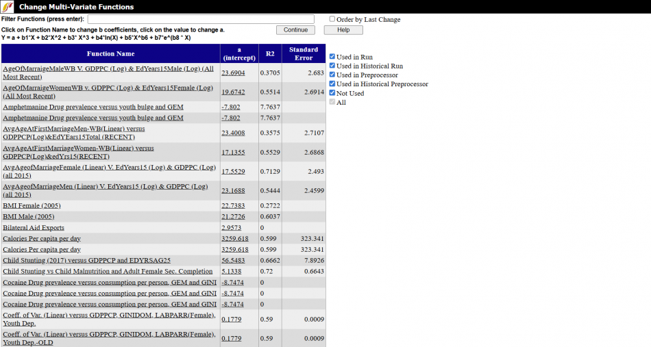 Begin at the Main Menu of IFs. Choose | Begin at the Main Menu of IFs. Choose '''Scenario''', '''Change Selected Functions''', and click '''''Bivariate Function.''''' This page displays a table with multivariate function names, their a intercept, r-square, and standard errors. Search for a particular function using the search bar or scroll through the table to find the desired function. Use the filter options ('''Used in Run''', '''Used in Historical Run''' etc.) to the write of the table to filter for functions that are used for particular model tasks, or not used at all. | ||