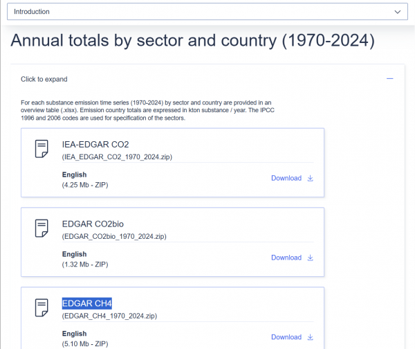 - Click the most recent database. For instance in 2026 the latest database is "EDGAR_2025_GHG 1970-2024 (CO2, CH4, N2O, F-gases)"