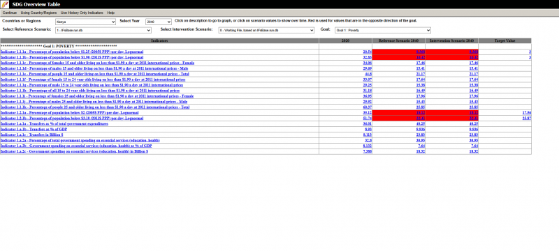 An example of the SDG Overview Table display for Kenya in the year 2040 with goal 1 selected.