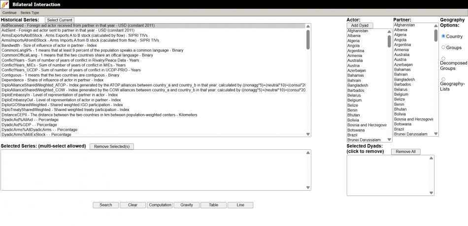 • Saved Formulas: Formulas created and saved using the Computation feature are housed here. The DYADICMILSTOCK formula is loaded by default and is a formula of imports and exports of arms as a stock, representing cumulative arms trade of a dyad. When a formula is added to the Selected Series table three new menu options appear: Save Formula, Rename Formula, Edit Formula, Edit Gravity.