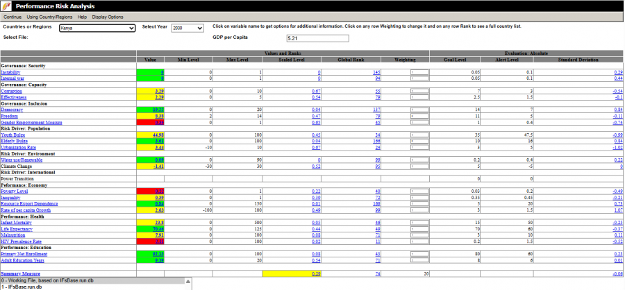 This display feature of IFs allows users to analyze and evaluate any Run-Result-File normatively. Users can set evaluative criterion and assign them numerical weights. The model is then run and each criterion is evaluated with respect to what variables most heavily affected the resulting number.